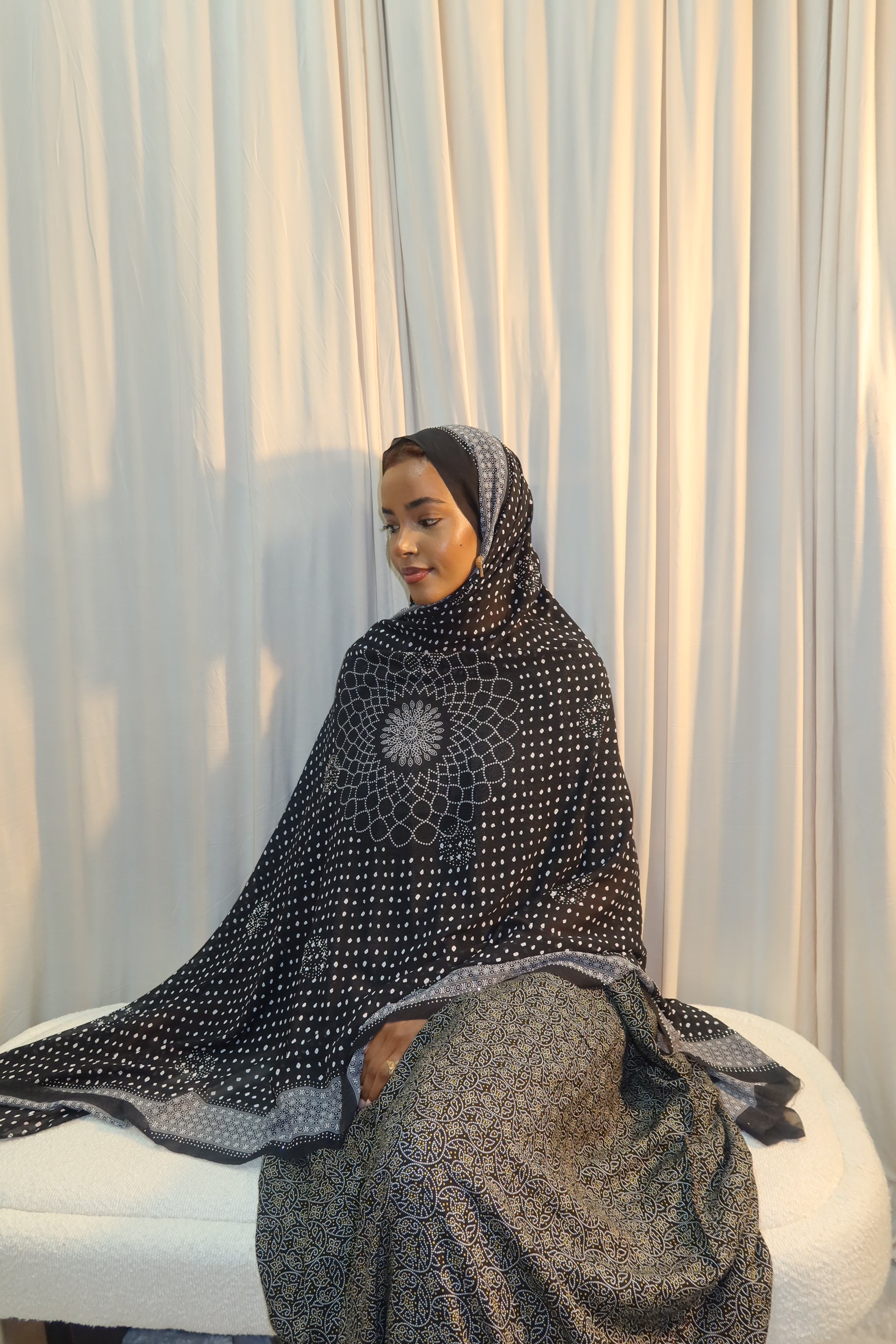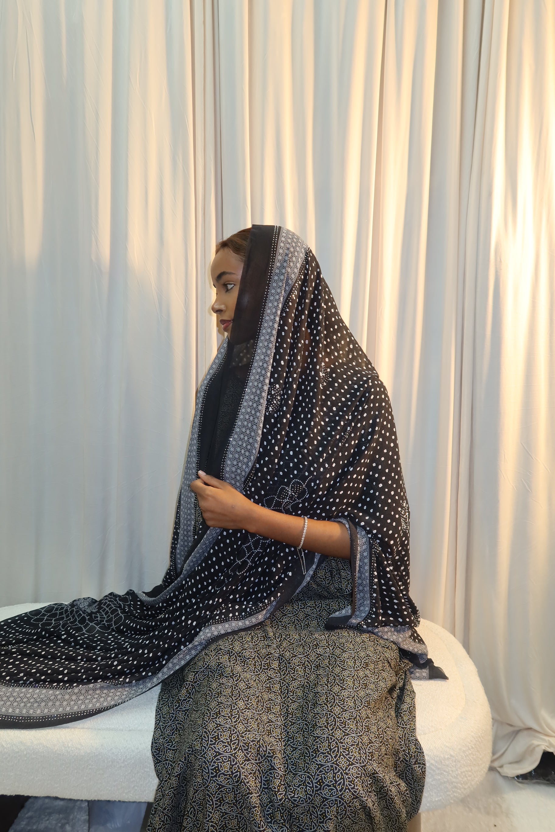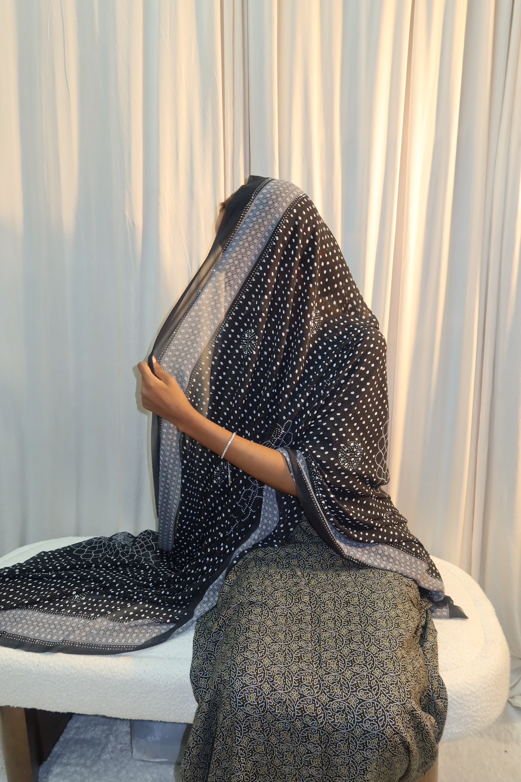 Noor Black Baati Set — where elegance meets radiance. This stunning black baati is adorned with delicate rhinestones that catch the light with every move, adding a graceful shimmer to your look.